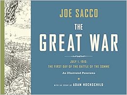 Joe Sacco is a journalist and comic book artist. Born in Malta, he is now a citizen of the U.S. living in Portland, Oregon. He has gained a reputation for reporting on some of the world’s top hot spots in the manner of a comic book style. He has written books on the Bosnian War, the Gulf war and the Palestinian situation. This book, which I received a couple of weeks ago, is somewhat of a departure from his previous subjects. It is a continuous drawing of the battle as it develops from the evening of June 30th to the evening of July 1st, folded concertina style into 24 plates (or pages). Beginning with Haig leaving church that evening it then shows in the minutest detail how the preparations for the battle unfold. The initial bombardment by heavy guns, thousands of troops moving into position with horses, men, wagons and piles of munitions are all meticulously portrayed in line drawings. Night falls and leads to dawn as men take up their positions and prepare for the assault. When they start going over the top, Sacco correctly portrays the men with arms at the port as they expected little resistance. There then follow several pages of the battle … shells bursting … the men struggling to advance … falling, dying … dead. It ends with the return, the roll calls, advanced dressing stations and burial.His research of the subject was extensive. Having spent fifteen years in Australia before he moved to the States in 1978, he became fascinated by the Great War, especially of Gallipoli and the Dardanelles and it apparently never left him. He has amassed a large library on the war and he states in the forward that his inspiration for the work was influenced by the authors Martin Middlebrook and Lynn MacDonald among others.This is a fascinating work.